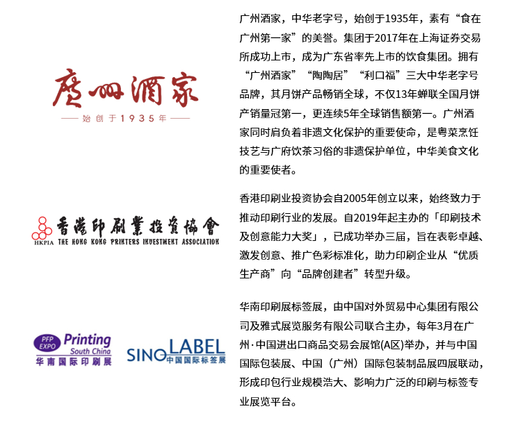 战略合作核心亮点: 权威赛事升级,聚焦技术+创意双赛道 香港印刷业投资协会作为活动主办方,联合印刷科技研究中心、广东省包装技术协会创新中心和东莞市出版印刷业协会等10余家粤港澳头部机构,依托华南国际印刷展、中国国际标签展(又称华南印刷展标签展)等专业平台,共同推出本届大奖。 深化“赛事+产业”协同机制 本届【印刷技术及创意能力大奖】的指定版面素材由广州酒家集团提供,参赛作品需围绕其品牌视觉需求展开创意设计。获奖企业将在广州酒家集团未来供应链入库环节中获得优先考虑,拓展合作空间。这一模式不仅为赛事注入真实商业场景,更通过“以赛促产”推动印刷技术从“达标”向“商用”延伸,助力大湾区印刷企业实现从“制造商”向“品牌服务商”的战略转型。 2026年华南印刷展标签展现场见证大赛高光时刻 所有精彩都将在2026华南印刷展标签展展会现场呈现,届时我们将共同见证: 🏆 【第四届印刷技术及创意能力大奖】颁奖典礼:荣耀加冕,见证新锐崛起。 🎨 得奖作品及新工艺展示:一站式览尽包装前沿趋势。 💡 主题沙龙活动:围绕“重塑品牌包装价值链”,与行业大咖展开深度思想碰撞。 三方资源优势互补,共筑湾区产业协同新生态 此次合作汇聚了三方核心资源: 广州酒家作为承载近九十年粤式风华的中华老字号,不仅拥有深厚的品牌文化底蕴,更凭借“广州酒家”“陶陶居”“利口福”三大中华老字号品牌在食品行业的广泛影响力,为包装创新提供真实的品牌应用场景。 香港印刷业投资协会携其在印刷标准化、技术创新和人才培养方面的专业积淀,以及连续三届成功举办“印刷技术及创意能力大奖”的经验,为合作提供技术支撑和行业洞察。 华南印刷展标签展2026年整体规模达15万平方米,汇聚超2200家参展商,预计吸引逾13万专业观众。展会凭借其庞大的行业资源、国际化平台和产业集聚效应,为创新成果提供最佳展示窗口和推广渠道。 合作愿景与期许 广州酒家集团:期待通过此次合作挖掘更多优质供应商,借助赛事桥梁提升产品包装质感,深化港澳市场布局,并通过华南印刷展标签展平台展示创新成果,构建更直接的供需对接渠道。 香港印刷业投资协会:在成立20周年之际,将以赛事为纽带,联动各方资源构建“技术交流-创意孵化-商业落地”的全链条生态,持续助力大湾区印刷业向高端化、品牌化、国际化迈进。 华南印刷展标签展:将充分发挥平台资源集聚与市场链接优势,为创新技术和设计提供专业展示空间,促进产业链上下游的高效对接,推动优秀成果的商业化应用与行业推广,助力大湾区包装印刷产业的价值提升。 携手同行,价值共创,共塑湾区包装新生态 这一战略合作不仅是赛事升级,更是印刷包装行业从“生产制造”向“品牌服务”转型的重要里程碑。通过三方资源整合,将助力广州酒家等中华老字号实现品牌年轻化、包装国际化,同时为印刷企业提供从技术提升到品牌出海的完整解决方案。 依托华南印刷展标签展的国际平台与香港印投的传播网络,合作成果将辐射港澳台地区及海外市场,让全球更多消费者通过创新包装认识广州酒家所代表的中华美食文化,实现“技术提升、品牌出海、产业共赢”的长期目标。 这一强强联合必将激发粤港澳大湾区印刷包装业的巨大潜能,共同塑造包装价值链新生态,为行业高质量发展树立全新标杆。 特别鸣谢 本届大奖的顺利举办,承蒙以下单位的大力支持与协助,在此谨表诚挚感谢: 协办机构:印刷科技研究中心、广东省包装技术协会创新中心、东莞市出版印刷业协会 支持单位:广州酒家集团、香港印刷出版媒体业工会、华南国际印刷展、中国国际标签展、印刷媒体专业人员协会、香港纸业商会、澳门印刷业商会、香港印艺学会、深圳市印刷行业协会、香港印刷业商会、香港数码印刷协会、广州包装印刷行业协会、广州市白云区印刷包装行业协会、中山市印刷包装行业协会、江门市印刷协会、惠州市印刷协会、珠海市印刷协会、肇庆市印刷复制业协会